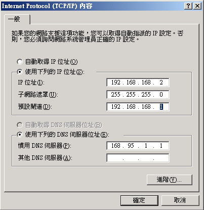在「控制台 > 網路連線 > 區域網路 > 內容」將自己的 IP 位址設為 192.168.168.2/255.255.255.0。