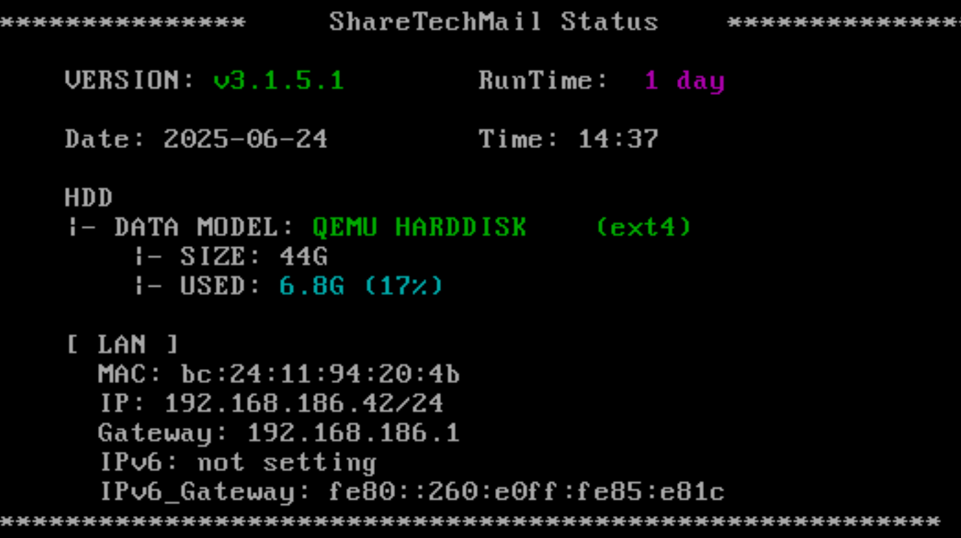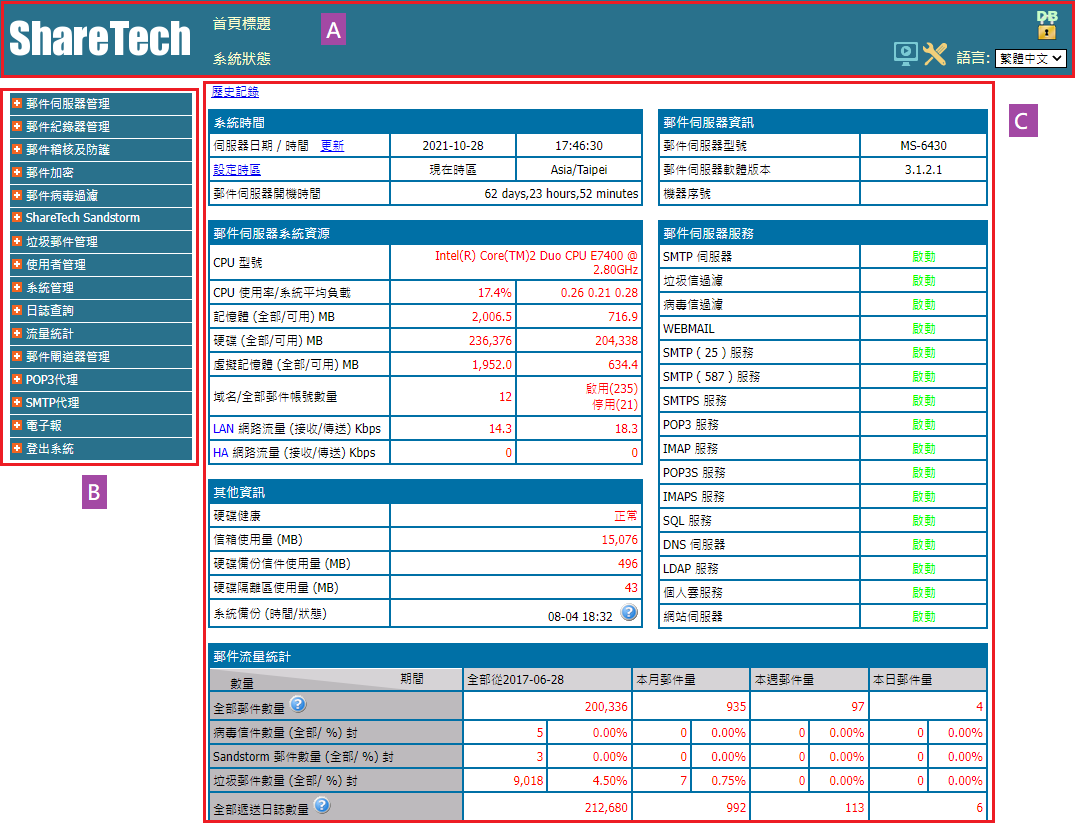 【郵件伺服器開機時間】: 顯示目前郵件伺服器設備從開機到現在運作時間,重新開機後,數字會被歸零。
