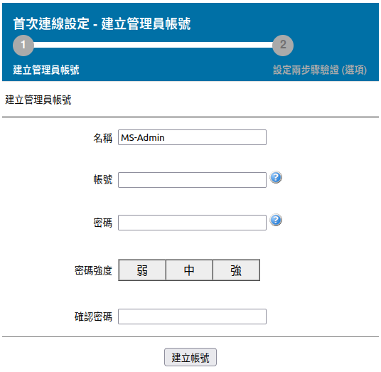 連線後會跳出以下畫面。3.1.5 版本之後,系統會要求建立安全性足夠的帳號才能登入