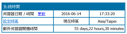 顯示目前伺服器日期/時間、設定時區與郵件伺服器開機時間。