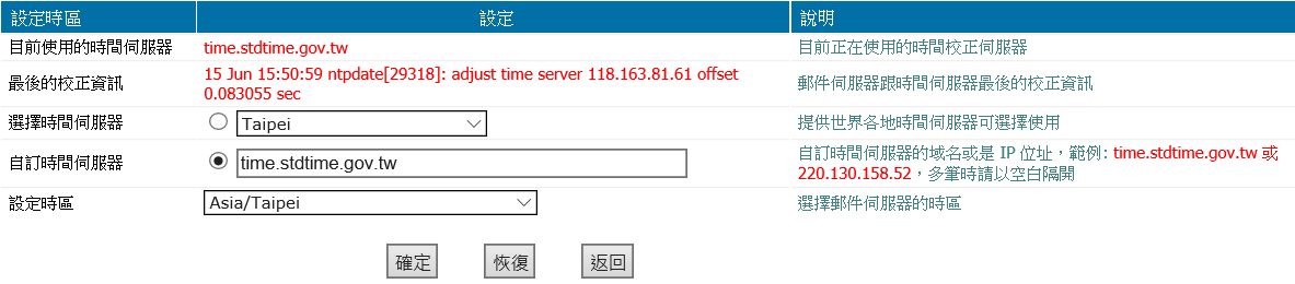 【設定時區】: 按下 設定時區,可以進入設定郵件伺服器的時區, 郵件伺服器預設會向「time.stdtime.gov.tw,clock.stdtime.gov.tw,tick.stdtime.gov.tw,tock.stdtime.gov.tw,watch.stdtime.gov.tw」這 5 個時間伺服器自動對時。