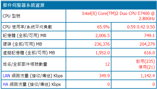 顯示郵件伺服器使用的資源,如 CPU (型號/系統負載)、記憶體、硬碟、虛擬記憶體、域名/全部郵件帳號數量、網路流量使用狀況。