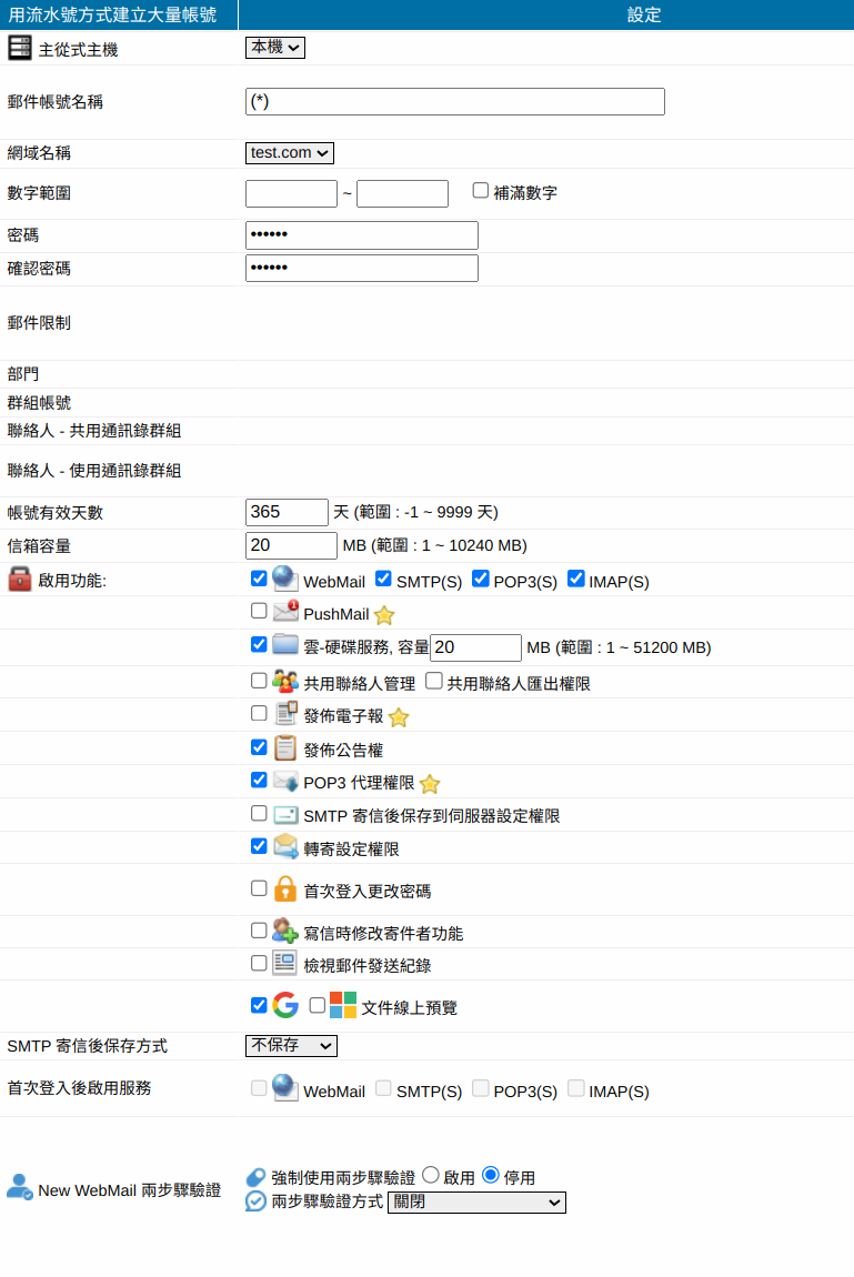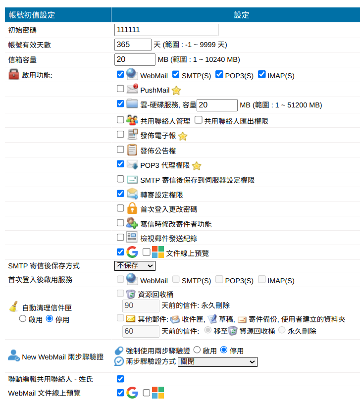 雲硬碟服務:是否啟用在 WebMail 介面使用雲-硬碟服務,即共享資料夾。啟用時,可設定每個使用者網路硬碟的大小,範圍是 1~51200MB,開放這項功能時需考量郵件伺服器本身的硬碟容量。