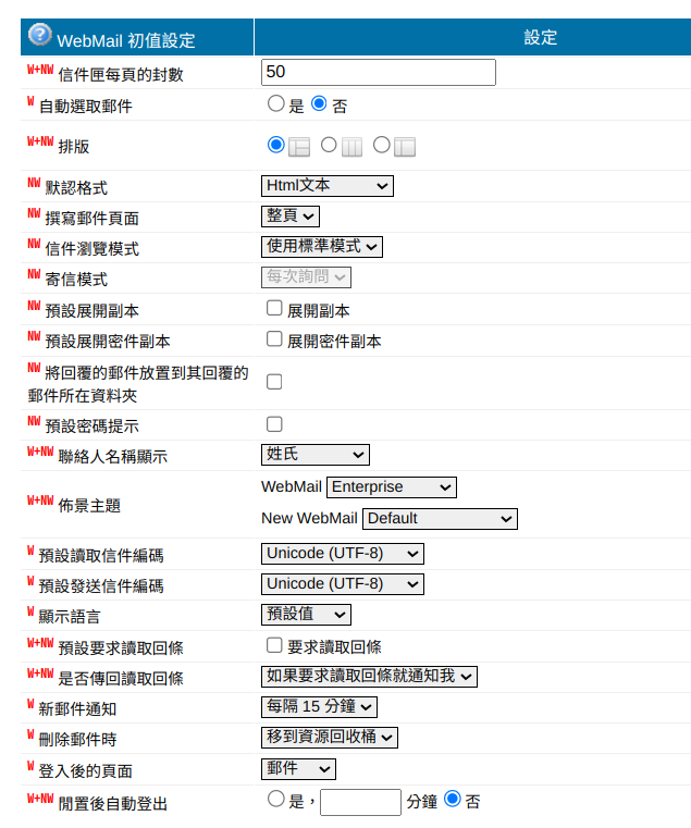 當帳號建立完成並且賦予 WebMail 功能後,管理者可以在這裡設定進入 WebMail 的初值,當然使用者登入後還是可以根據自己的需求修改。