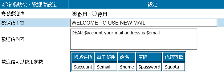 對於新增的帳號,可以設定讓郵件伺服器主動寄送一封信件,顯示歡迎詞或是通知新用戶注意事項。