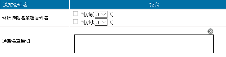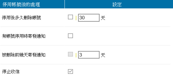 的設定發送通知給管理者。【停止收信】: 當帳號被停用後,是否繼續收信。