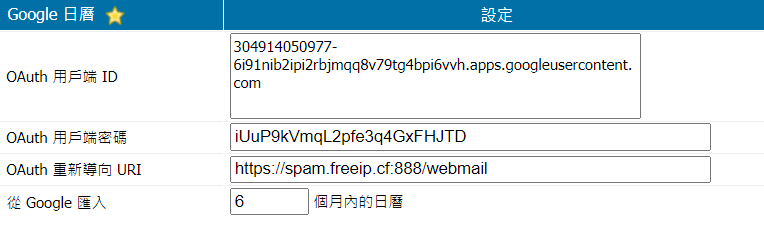 【從 Google 匯入】: 匯入幾個月內的 Google 日曆到 WebMail 行事曆上,0 代表全部都匯入。