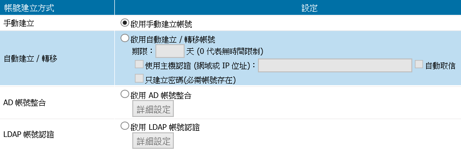 眾至郵件伺服器提供幾種帳號建立方式:手動建立、自動建立/轉移、AD 帳號整合與 LDAP 帳號整合。
