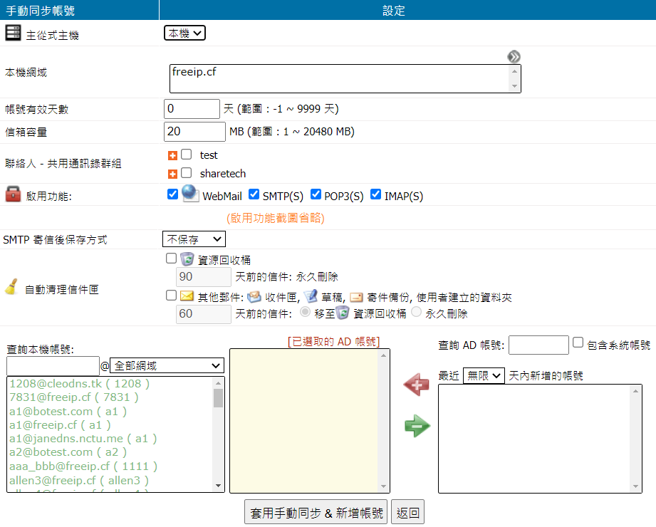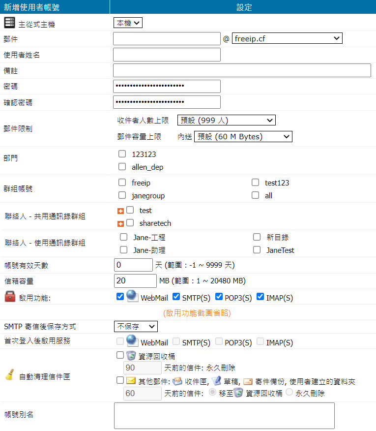【停用後多久刪除帳號】: 停用後,超過幾天把此郵件帳號刪除。0 表示停用時就立刻刪除。