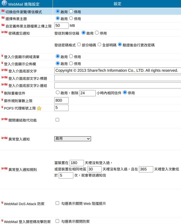 管理者在 WebMail 初值設定的內容,使用者登入 WebMail 後可以依需求更改;而此處的進階設定大部分功能只有管理者能調整。