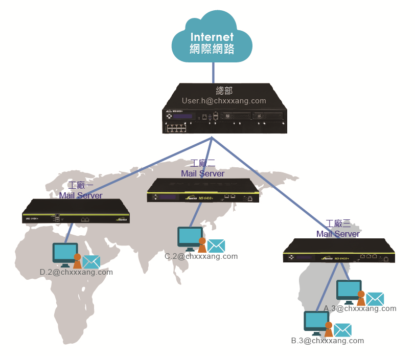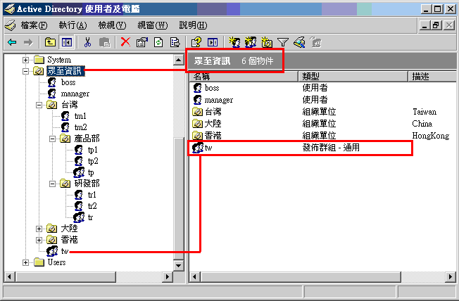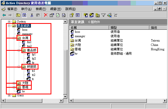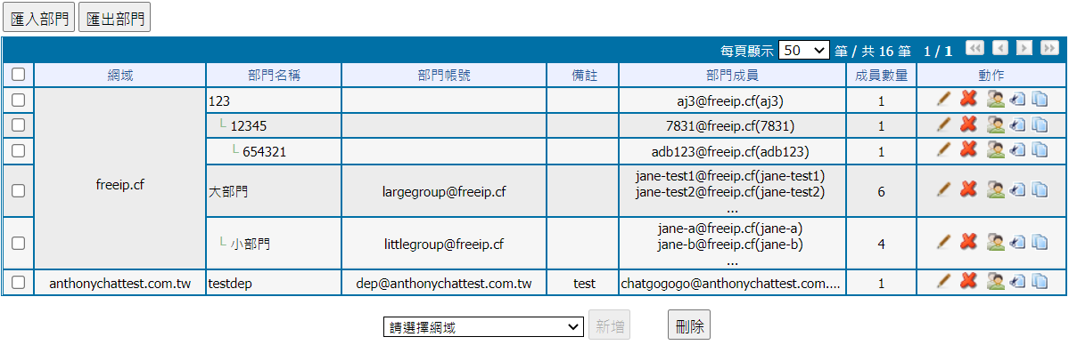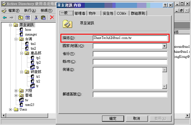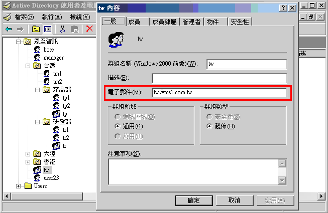 郵件伺服器X 內建部門管理功能,跟群組帳號不同的是可以跟企業實際的組織配合,也可以從 AD 伺服器上匯入組織資料。