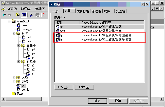 回到上一層,就完成帳號的選取。【備註】: 這一個群組帳號的詳細說明。