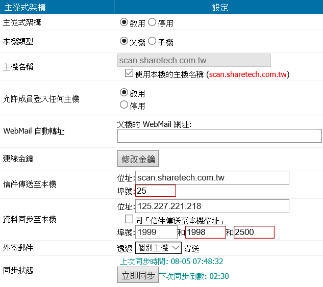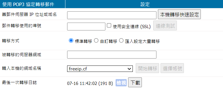 【舊郵件伺服器 IP 位址或域名】: 輸入原來的郵件伺服器 IP 位址或是網域名稱。 例如:192.168.1.100 或是 mail.A_domain.com,新的郵件伺服器會利用設定在【郵件轉移使用的埠號】向設定的舊郵件伺服器收信。