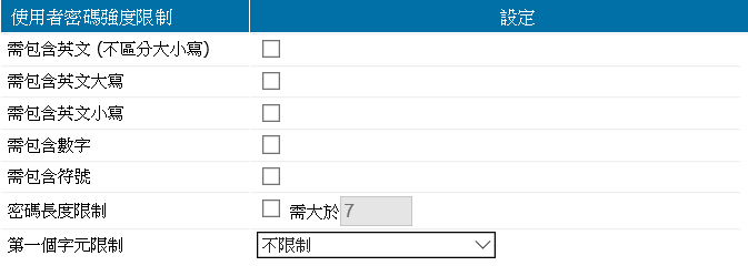 【初始密碼】: 每個新增帳號的密碼預設值,設定範圍為 1~100 個字元。管理者在手動新增帳號會自動帶出初始密碼,節省管理設定時間。