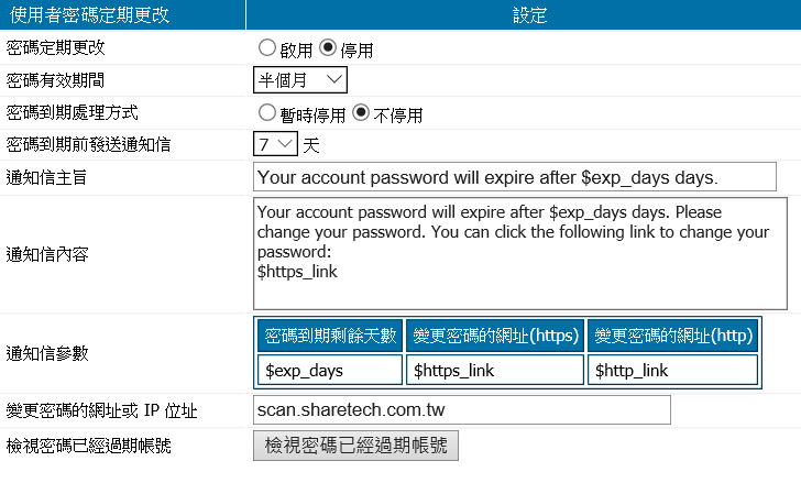 設定密碼定期更改的例外名單,這些使用者沒有密碼有效期間的限制。