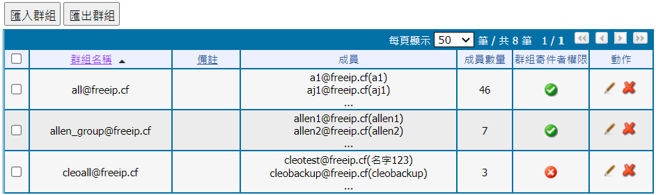 建立完成的群組會列表顯示,可以在此處操作匯入、匯出、編輯或刪除群組。