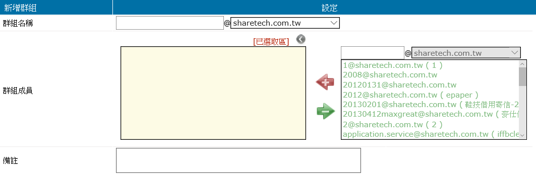 進入新增群組。因為郵件伺服器支援多網域的作業,可以選擇權限帳號的隸屬的網域。