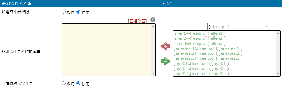是否設定群組帳號寄件的權限。設定當使用者收到群組郵件,按下回信後,此時寄件者是群組帳號還是自己本身的郵件帳號。