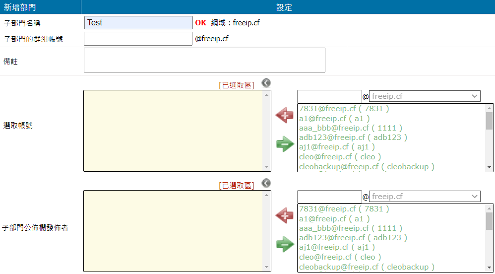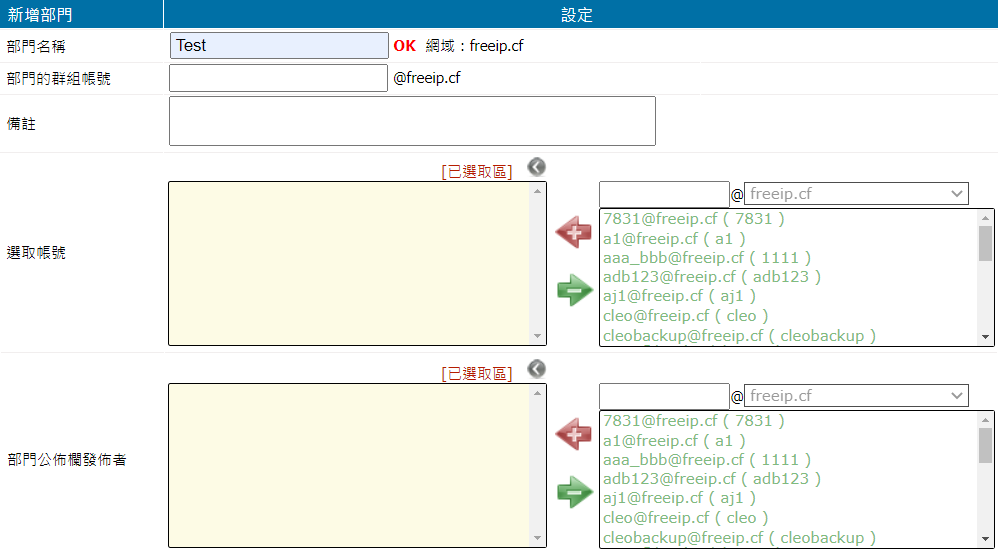 【部門名稱】: 建立部門名稱。輸入後,郵件伺服器會自動檢查是否有重複的部門名稱,沒有問題則顯示「