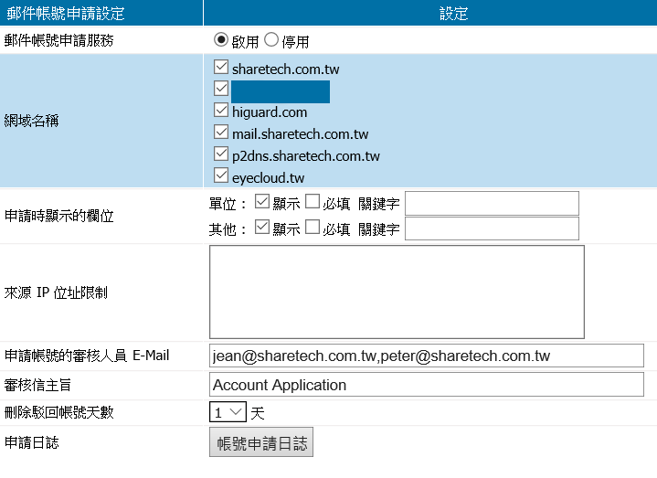【網域名稱】: 開放帳號申請的網域名稱,可多選。