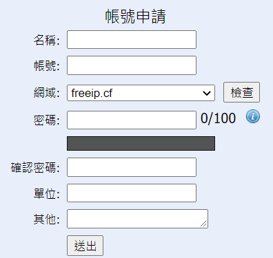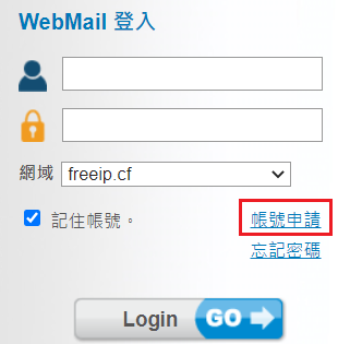 啟用這項功能後,在 WebMail 的登入畫面下方會顯示 帳號申請 的超連結,按下超連結可進入帳號申請頁面: