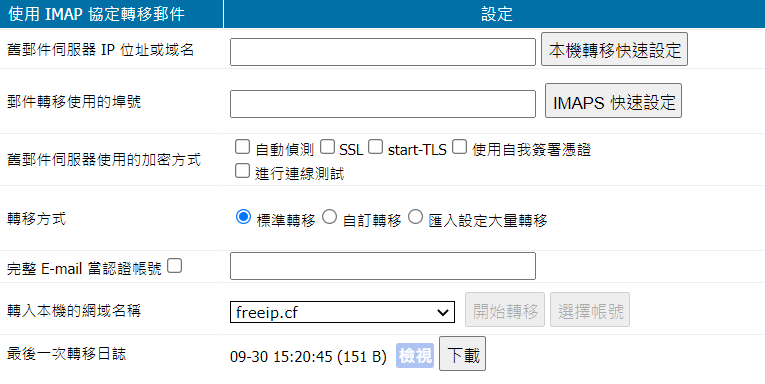 :如果舊郵件伺服器有支援 IMAPS 協定,建議埠號為 993,並使用「SSL + 使用自我簽署憑證」來轉移信件,以提升轉移過程中的流暢度。