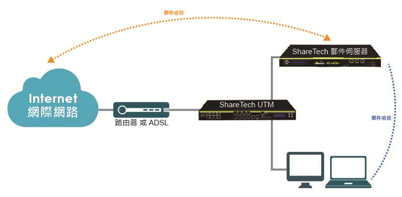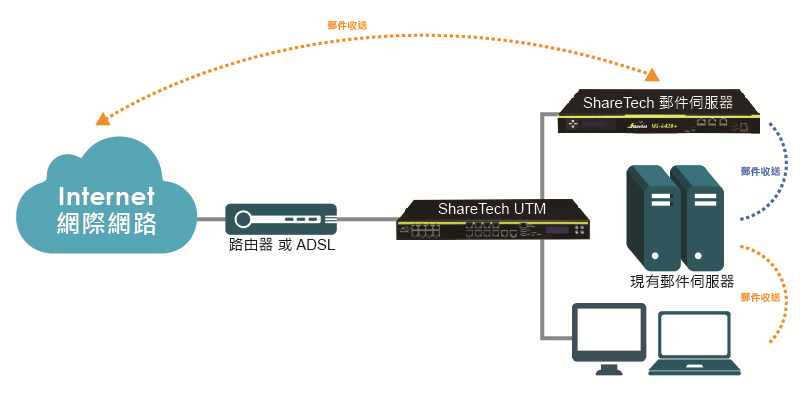 在企業的郵件伺服器前加上一台硬體式 Mail Server,協助企業做好病毒的防範,同時也將郵件過濾後再送到郵件伺服器,確保所有進入信件都正常。
