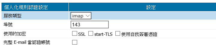 【埠號】: 連線服務時使用的埠號,預設值為 143,需輸入數字並範圍為 1 ~ 65535。