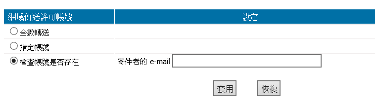 【全數轉送】: 在這個設定下,所有郵件閘道器收到的域名內的郵件,都會往代理的郵件伺服器轉送,不論這個帳號在郵件伺服器中是否存在。