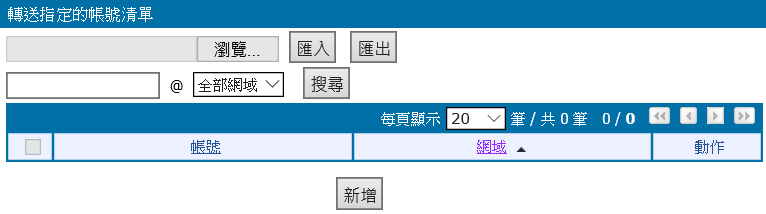 當網域傳送許可帳號選擇僅傳送指定帳號時,只有在此清單內的帳號才被允許傳送。將儲存在郵件閘道器中的帳號清單匯入/匯出,以便保存資料。