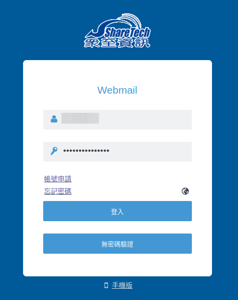帳號、密碼欄位:輸入正確的使用者帳號及密碼,點選【登入】進入NewWebmail。若啟用兩步驟驗證,點選【登入】後會跳出驗證欄位,輸入驗證碼再點選【登入】即可。
