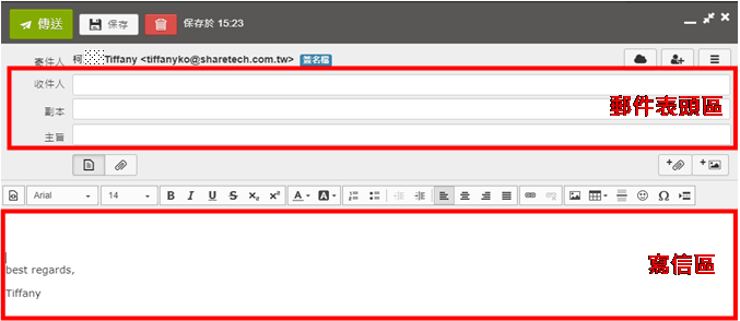 進入信件編輯器後,郵件表頭區會出現【收件人】、【主旨】等欄位,若想改變這些預設出現的欄位,可參考 5-1、一般設定 。