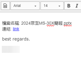 勾選想分享的圖片/檔案,按下【附加連結】可設定密碼、供下載期限、供下載次數,按下確定,NewWebmail會將檔案/圖片連結顯示於寫信區中。