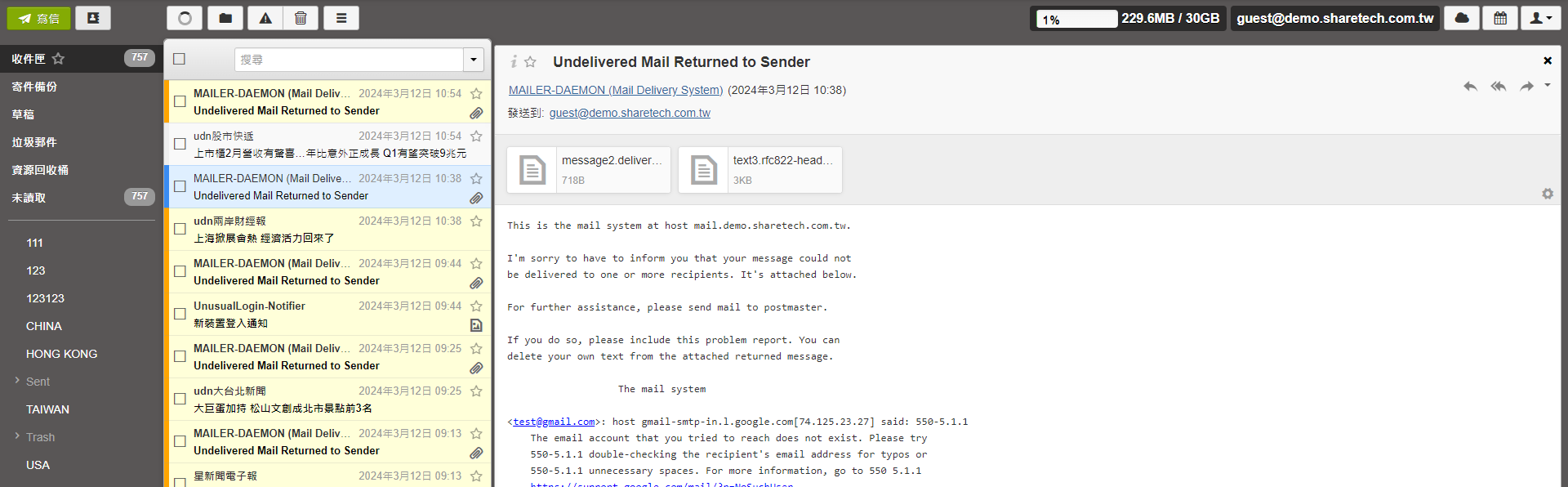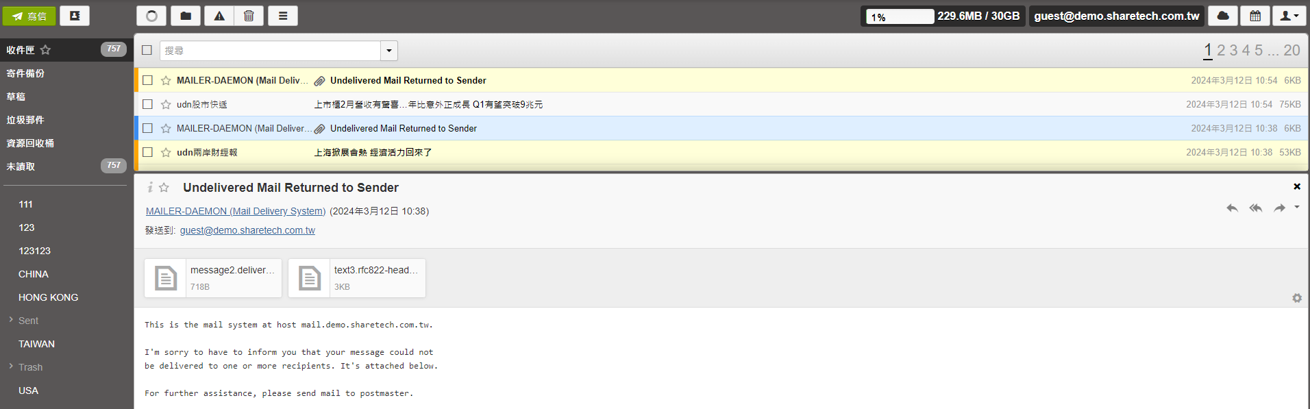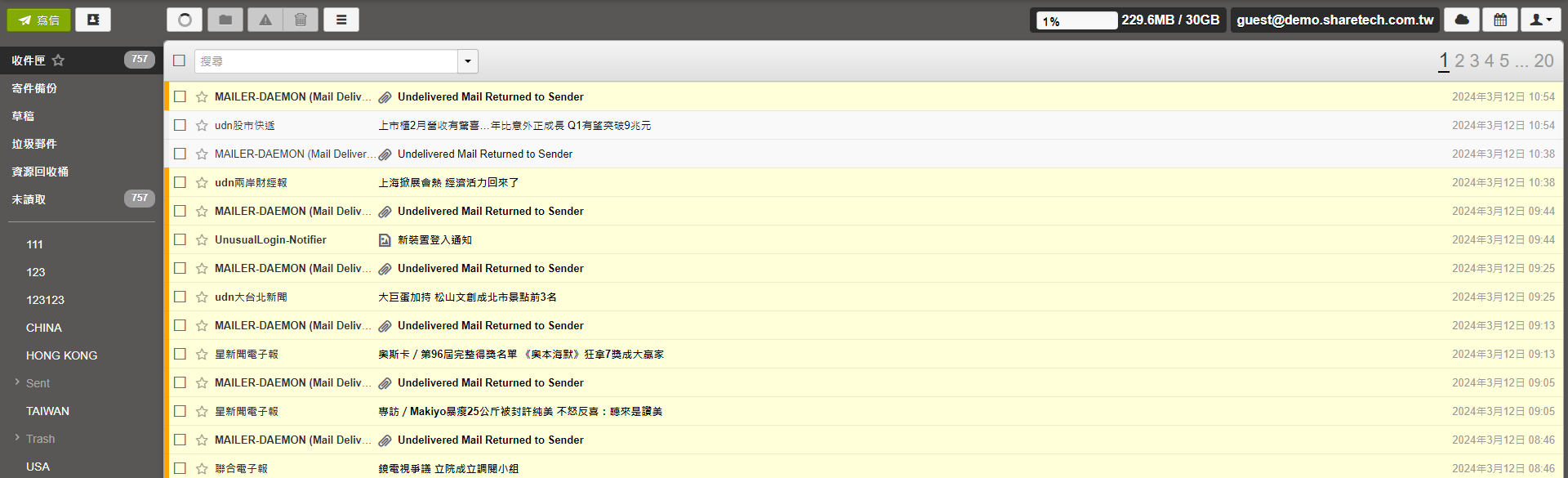 使用關聯式信件:New Webmail在主旨列會自動將支援IMAP Thread的郵件集合在一起方便閱讀,上面會顯示關聯式信件的封數。