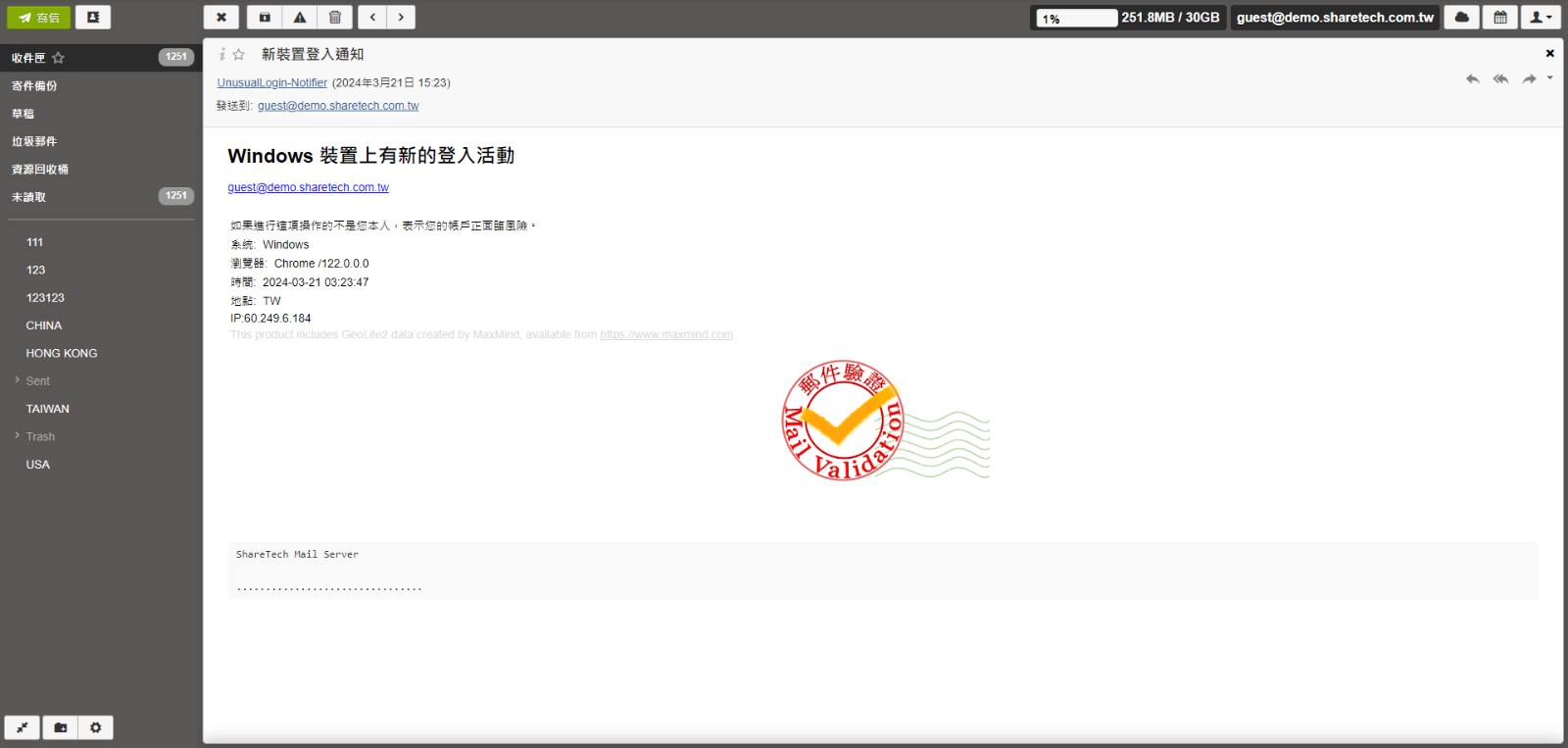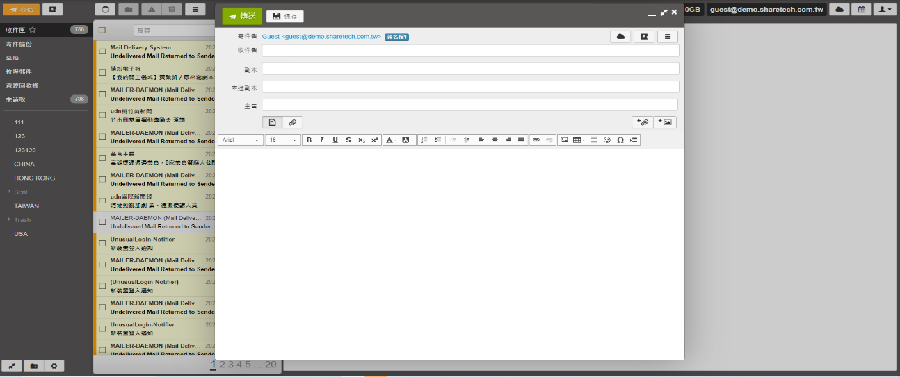 使用者名稱 :對方收到信後,寄件者欄位顯示的名稱,例如:圖示中使用者名稱為Guest,則當Guest寄出去的信件,對方收到其寄來的信件顯示的名稱為Guest。