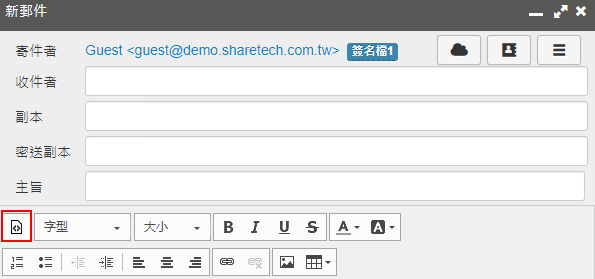 簽名:可自行編輯簽名檔,每封寄出的郵件最後面都會插入這個簽名檔,使用方式和撰寫郵件的介面一樣。