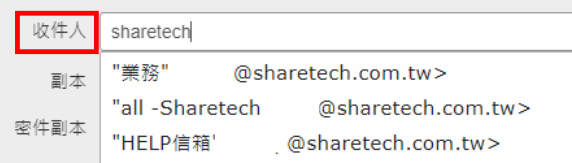隨打即搜(寫信-聯絡人):寫信時,在收件人欄位打上部分“使用者名稱”或“信箱帳號”,系統會自動尋找符合條件的聯絡人。若無勾選此項,則須打出完整信箱帳號,或點選收件人尋找。