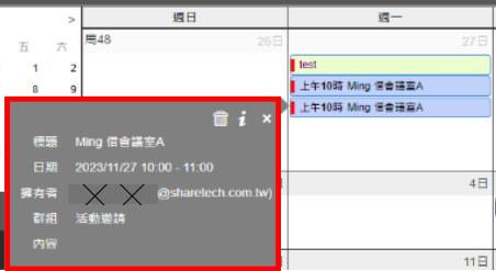 行事曆活動快顯方式:移致上方代表鼠標移動到活動上方會出現活動資訊。點擊代表鼠標點擊活動才會出現活動資訊