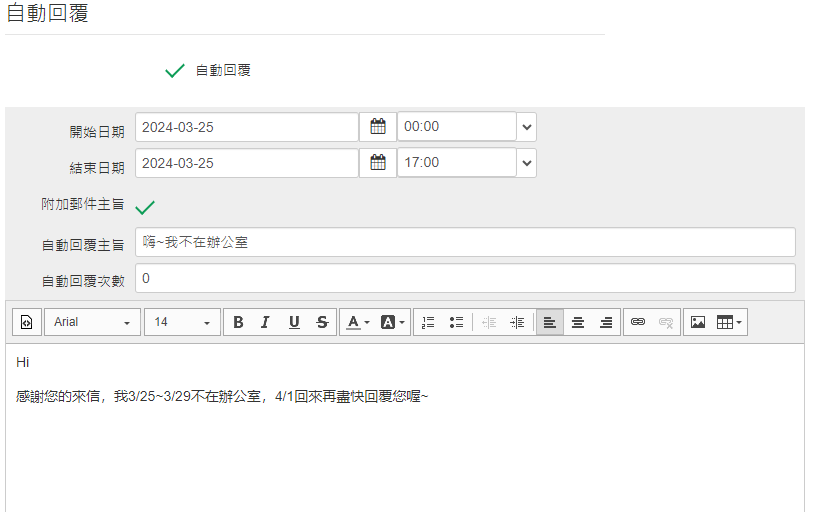 出差或休假前可設定【自動回覆】功能,休假期間若有人來信,系統會自動回信,讓對方了解您的狀態,以免等不到回覆。 自動回覆可以設定啟用的時間、主旨、回覆次數跟內容,在這個時間內,自動回覆才會生效。
