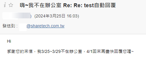 【附加郵件主旨】:收到自動回覆信件的收信方,主旨會顯示為[自動回覆主旨Re: 郵件主旨]