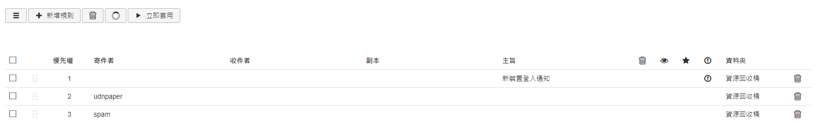 優先權:郵件規則比對順序是由第一條開始,只要比對成功後,就不會再繼續下面規則的比對,所以使用者要好好規劃自己的比對順序,善用