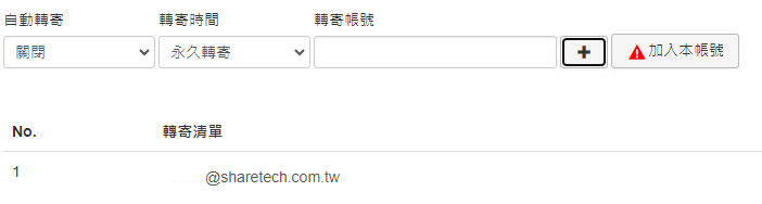 自動轉寄功能可以讓信件在指定時間,內轉寄給設定的目標。要注意,自己的帳號也要轉寄給自己,否則自己會沒收到。 按【加入本帳號】就可以將自己的帳號加入轉寄清單。
