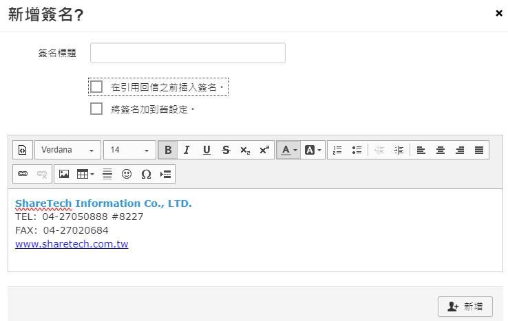 按下【新增簽名】後,輸入簽名檔內容,按下【新增】即新增成功。