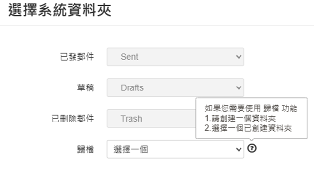 【已發郵件】、【草稿】、【已刪除郵件】不能更動。【歸檔】可選擇一個資料夾歸檔用,存放重要信件。