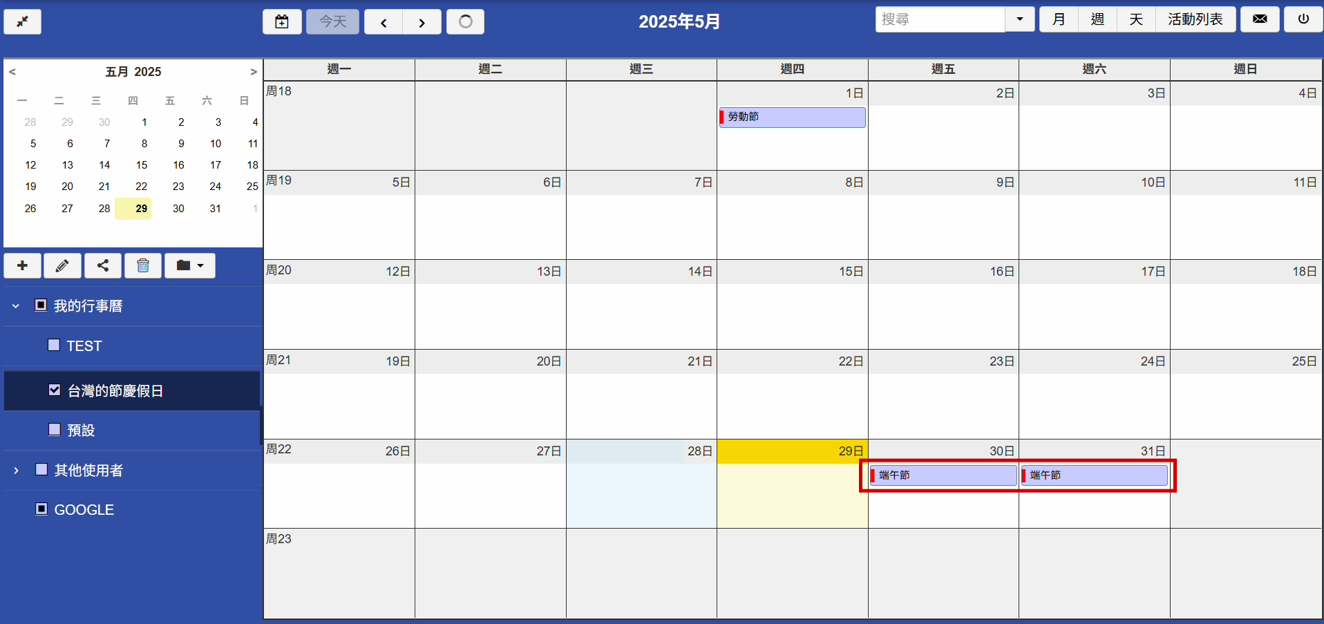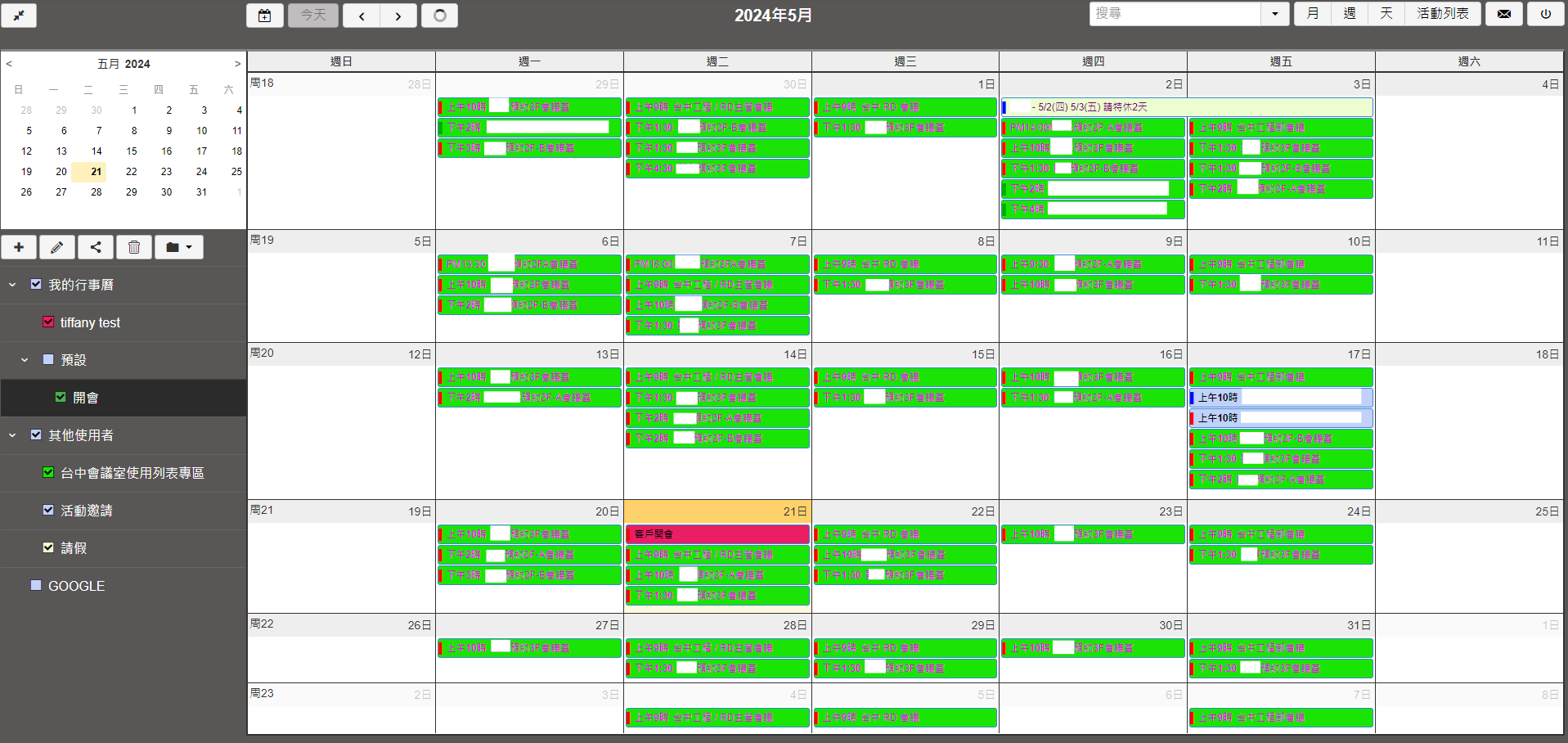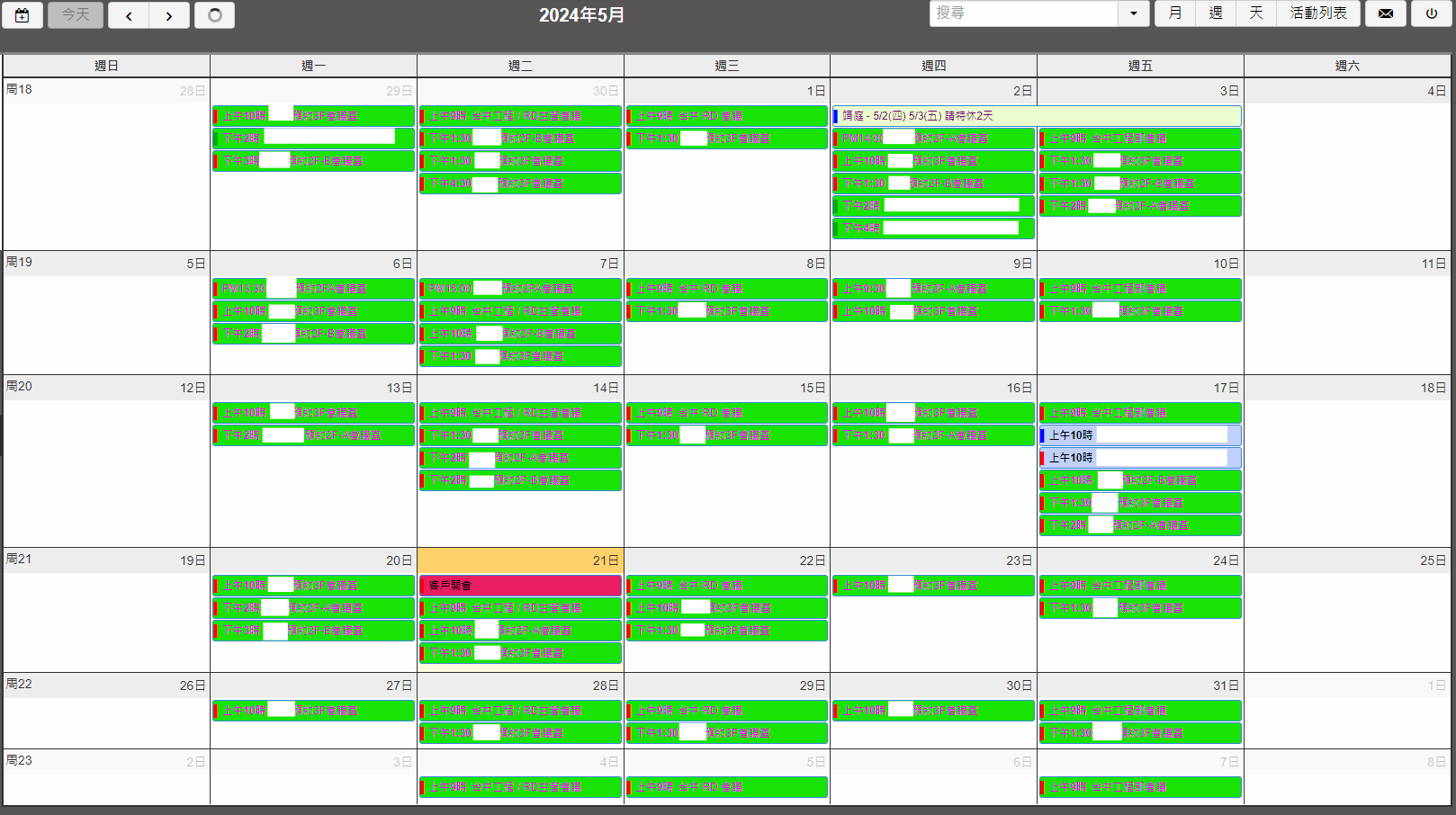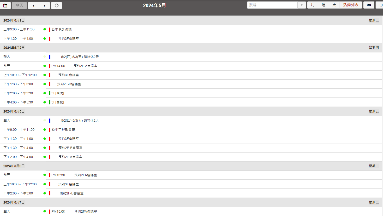 方形:顯示此行事曆,子行事曆依照狀態顯示