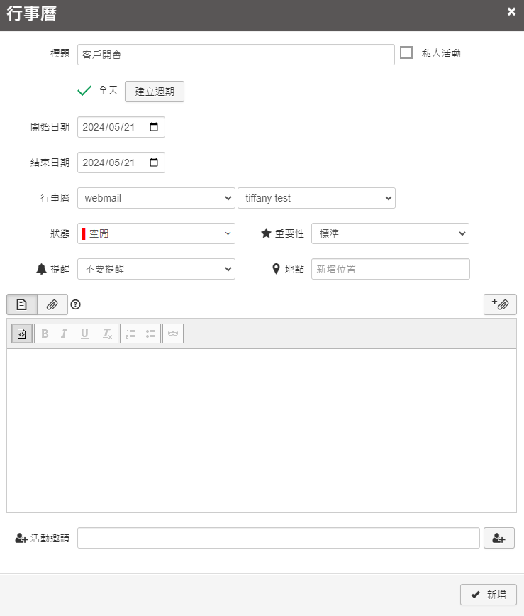 新增行事曆活動時,對話框下面有個【活動邀請】,可自行輸入受邀者郵件信箱或使用者名稱,或按