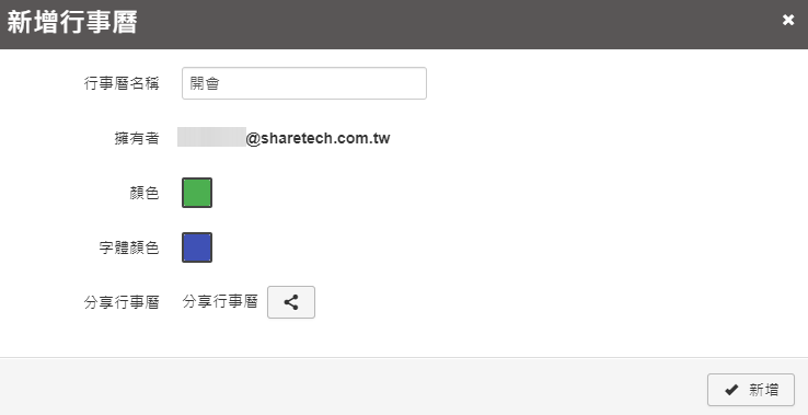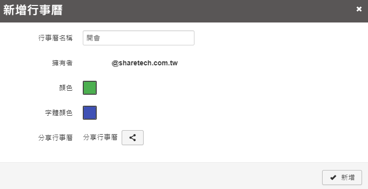 會出現新增行事曆對話框,輸入行事曆名稱、選擇行事曆顏色、字體顏色、是否分享行事曆,按【新增】即新增成功。