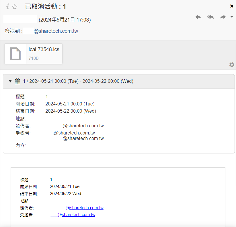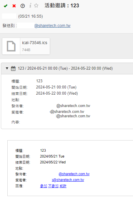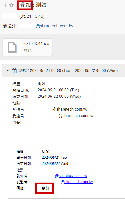 邀請郵件內容有:活動標題、時間、地點、內容、發布者、所有受邀者。受邀者可在【回應】選擇參加、不參加、或許,或在左上角選