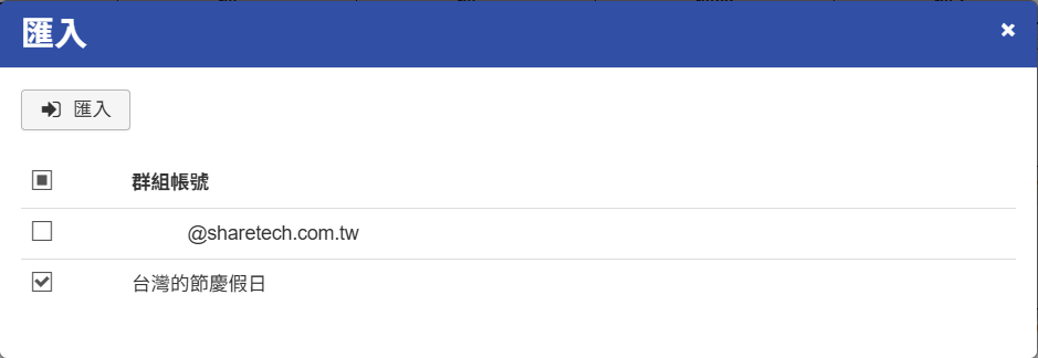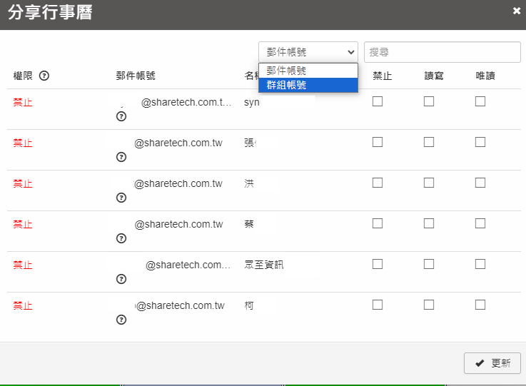 選擇要分享的行事曆,按|image225|會出現分享行事曆對話框,可選擇要分享的對象/群組帳號/權限。