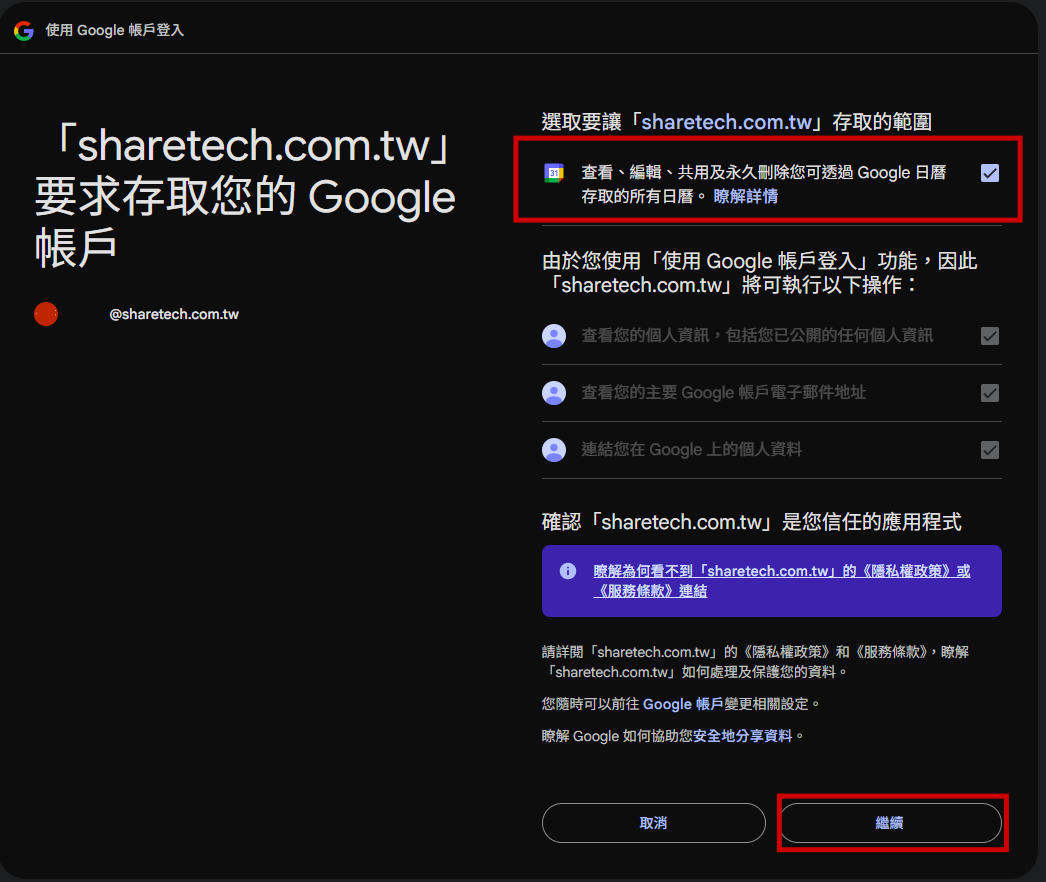 同意眾至資訊查看、編輯、共用及永久刪除您可透過Google日曆存取的所有日曆。